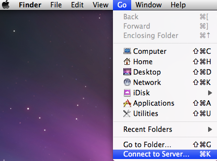 - In the Finder, under the Go menu, select Connect to Server... (keyboard shortcut: Command+K)
