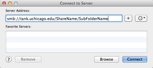 - A Connect to Server window opens. In the Server Address: field, type smb://tank.uchicago.edu/ShareName/SubfolderName. Replace ShareName with your department's directory on the shared drive. Replace SubfolderName with your department's subfolder on the shared drive (if it's provided, not all connections require a subfolder). Select Connect.