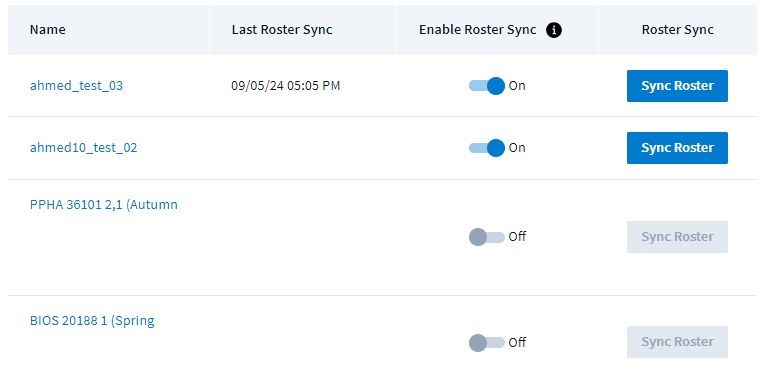- Next, you will see the Courses screen that lists all of the connected courses that you can sync with. Select on the Sync roster button to the right of each course that you wish to manually sync.