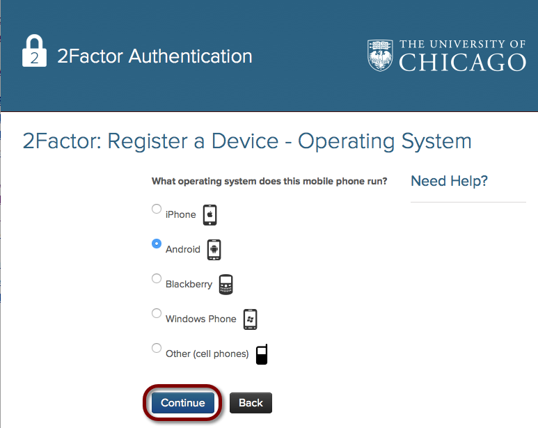 - Select your device's operating system and click Continue. (In this example, the operating system is Android.)