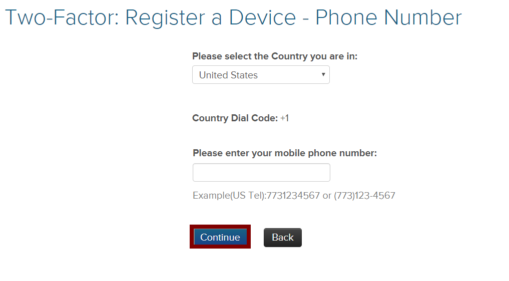 - Select the Mobile Phone option, then select Continue. You can find information on the use of tokens in the Two-Factor Authentication (2FA) FAQ.