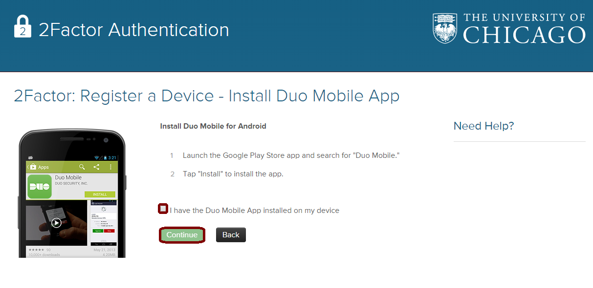 - Confirm you have installed the app on your phone by checking the box on the bottom of the screen, then select Continue.