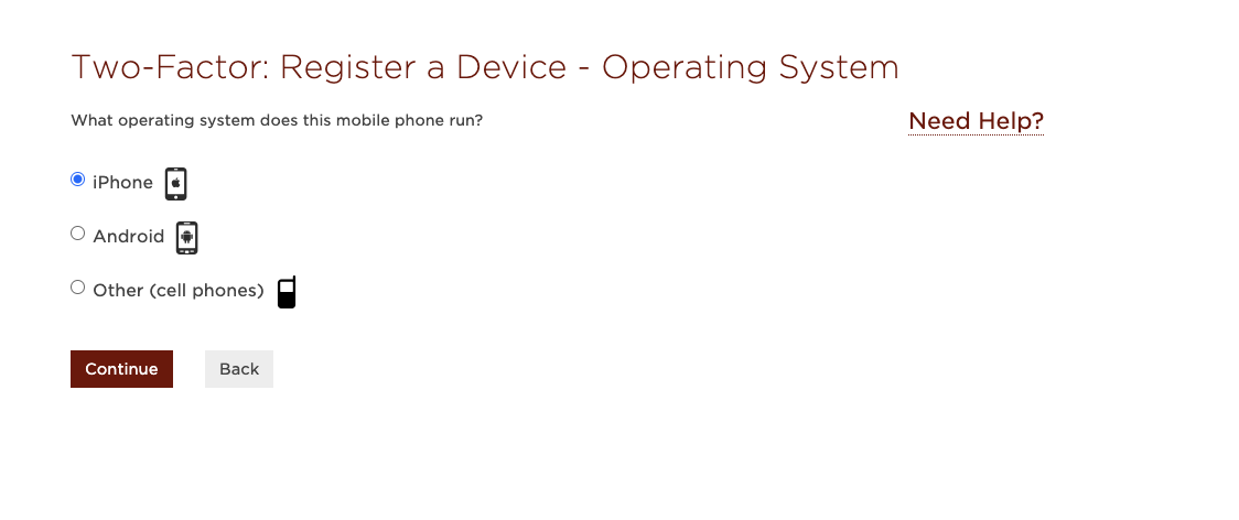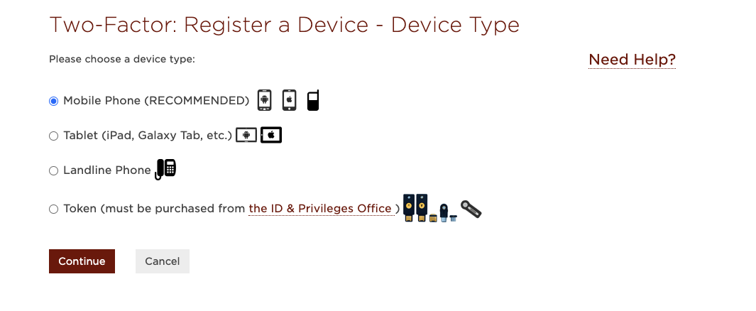 4. Select the Mobile Phone option, then select Continue. You can find information on the use of tokens in the Two-Factor Authentication (2FA) FAQ.