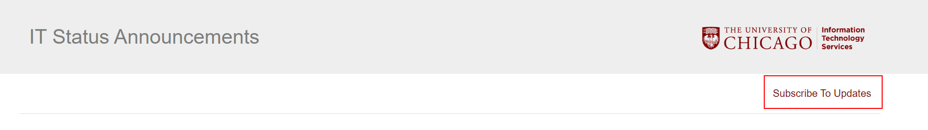 Note: SMS text message subscribers will only receive updates at the beginning and end of a service disruption. Email subscribers will also receive updates during a disruption if any are sent. Email updates to uchicago.edu email addresses may be delayed if there is a campus email or network outage. If campus email is unavailable during an outage, please refer to the Services Portal, the IT Status Announcements page, or subscribe to text alerts.
