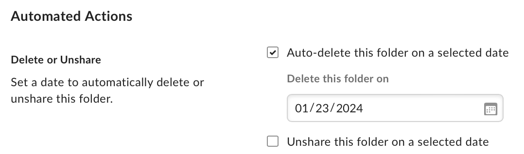 - Scroll down to the Automated Actions section, then check Auto-delete this folder on a selected date box, or check Unshare this folder on a selected date box, then select your date on the calendar.