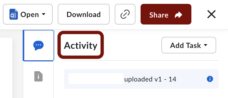- Select Add Task on the right in the Activity tab. (Note: the activity tab automatically populates to the right when a file preview is opened; however, in the case that the activity tab doesn't automatically open, select the activity tab button, represented by a comment bubble.)