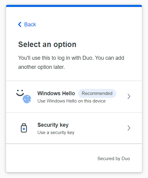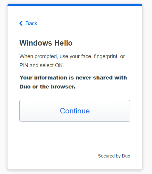 The Duo Universal prompt allows you to add, delete, or modify your registered devices directly from the Duo prompt. You may also add biometric authentication from the Duo prompt. If you have a device running on Windows 10 or later, you will have the option to set up Windows Hello to authenticate with Duo Universal. To use Windows Hello with Duo, in addition to the system requirement, make sure you also have the following: