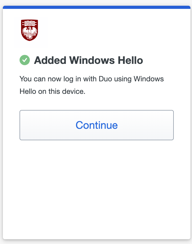 - When you receive confirmation that you added Windows Hello as a verification method, select Continue.