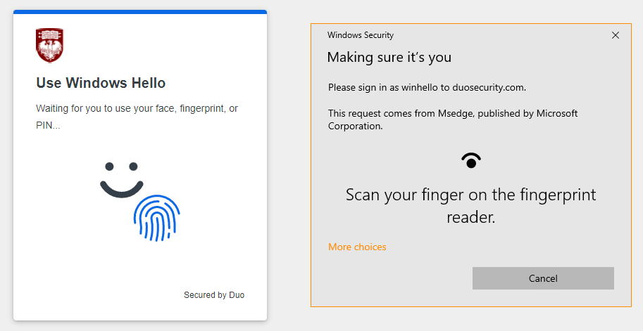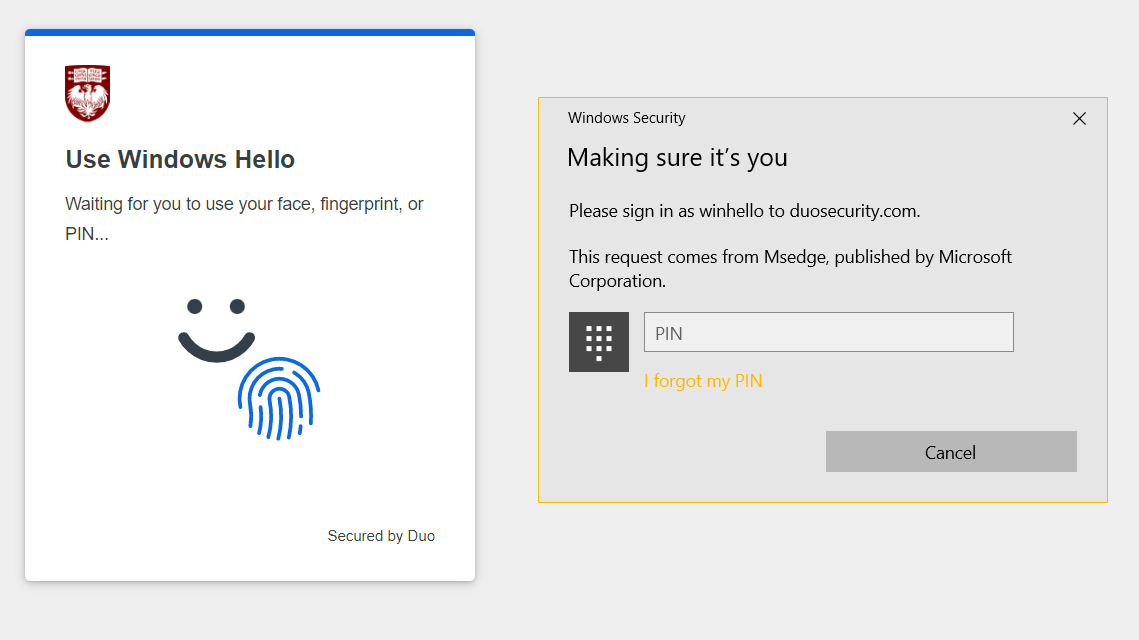 - Follow your device's prompt to enter your Windows Hello PIN, scan your fingerprint, or use facial recognition, just like you did when you set up Windows Hello in Duo. Successful Windows Hello verification logs you in without entering a password, and Duo Universal will send you to the application as a logged-in user.