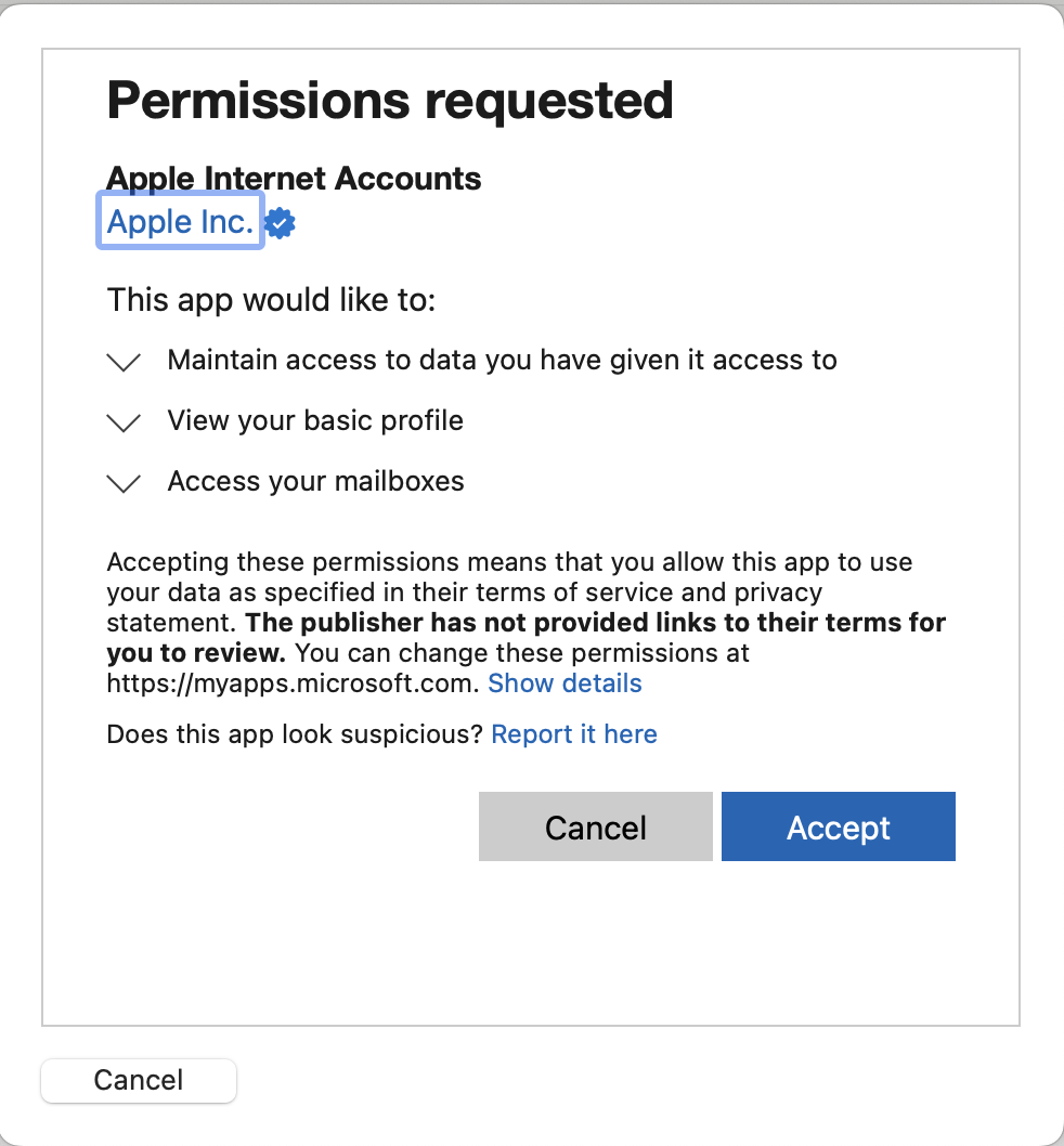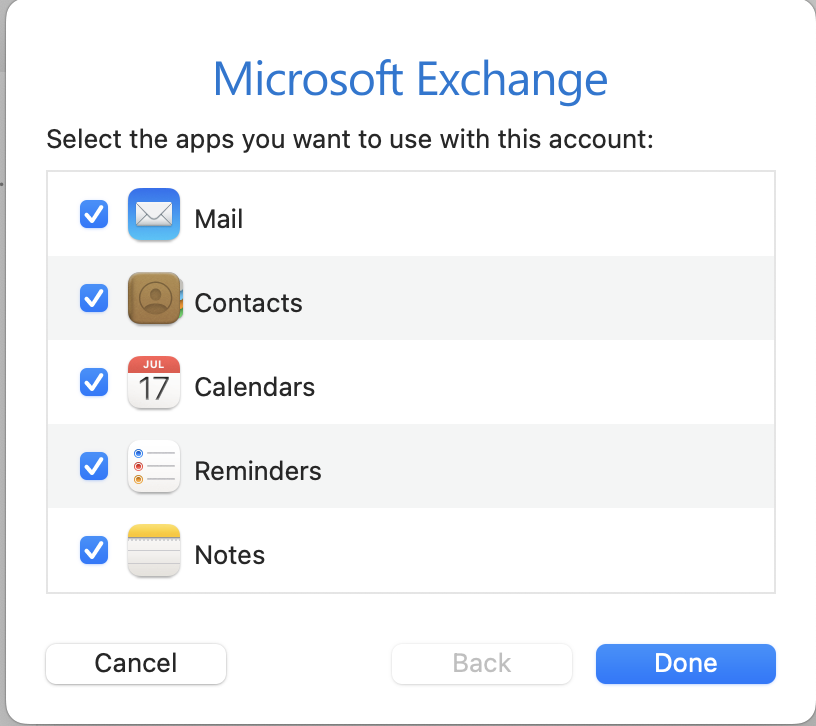 - Select the apps you want to use within your Mail app (i.e., Mail, Contacts, Calendars, Reminders, Notes) then select Done.