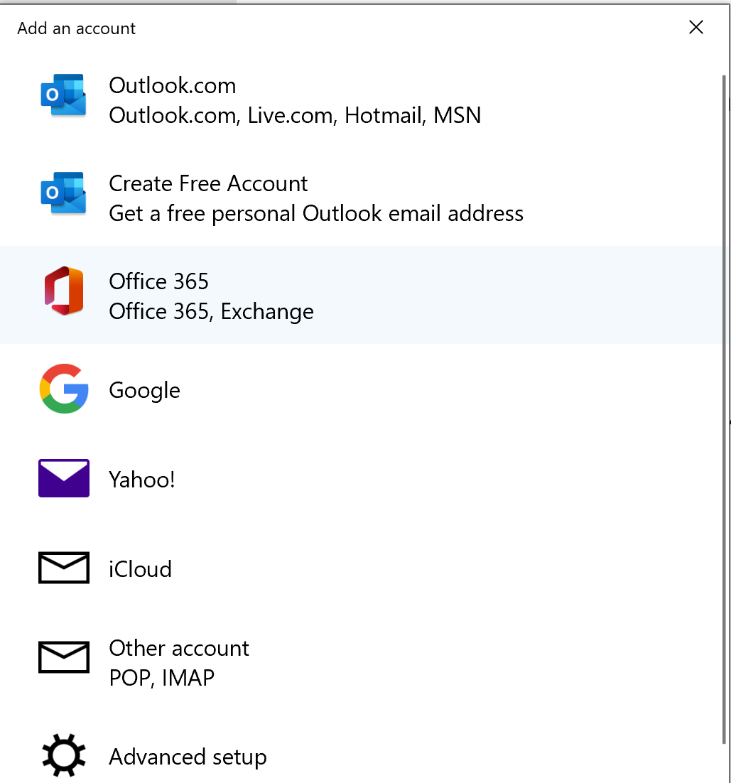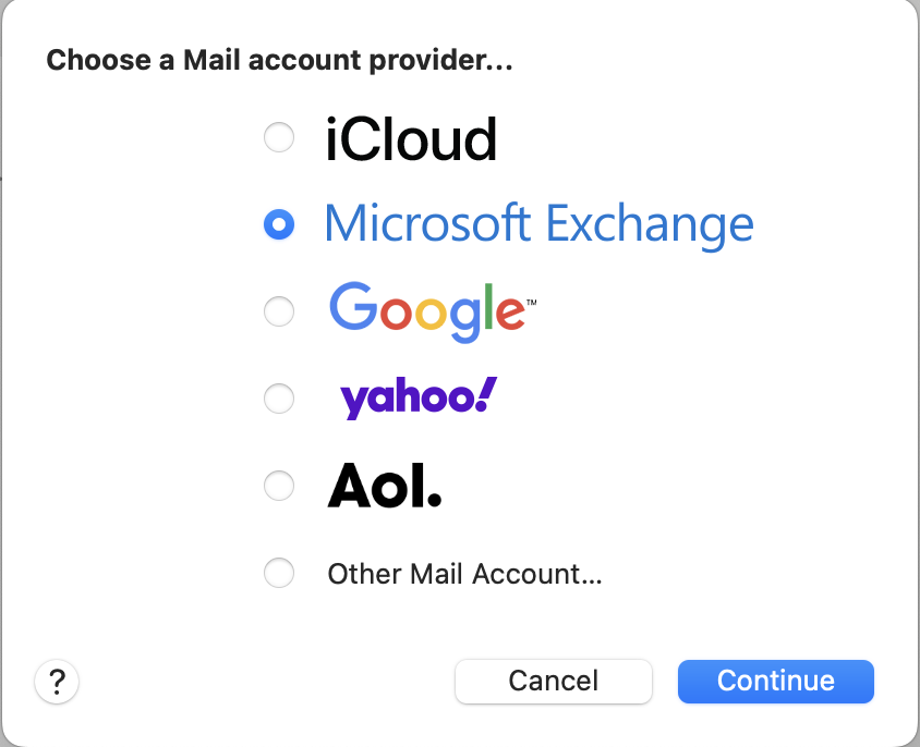 - Choose a Mail account provider. Select Microsoft Exchange, then select Continue.