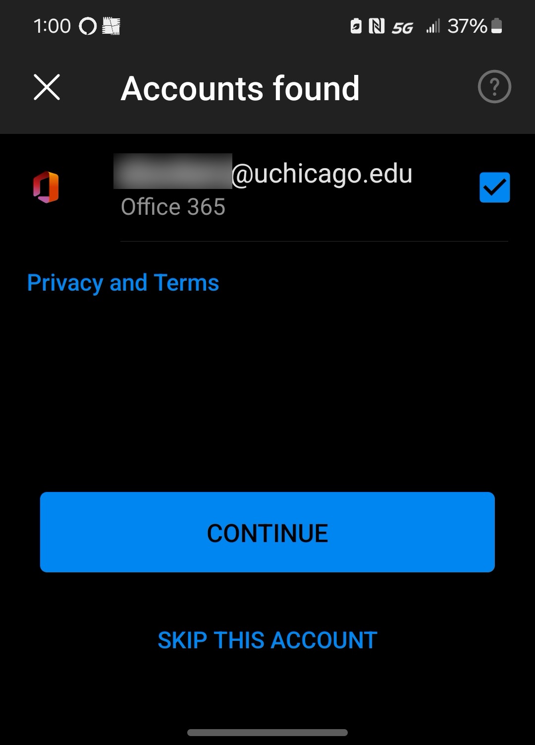 - If your device doesn't automatically find your UChicago account, enter your CNetID@uchicago.edu email address and tap Add Account.