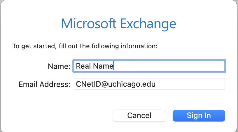 - Enter Your Name, type your Email Address (e.g., CNetID@uhicago.edu), then select Sign in.