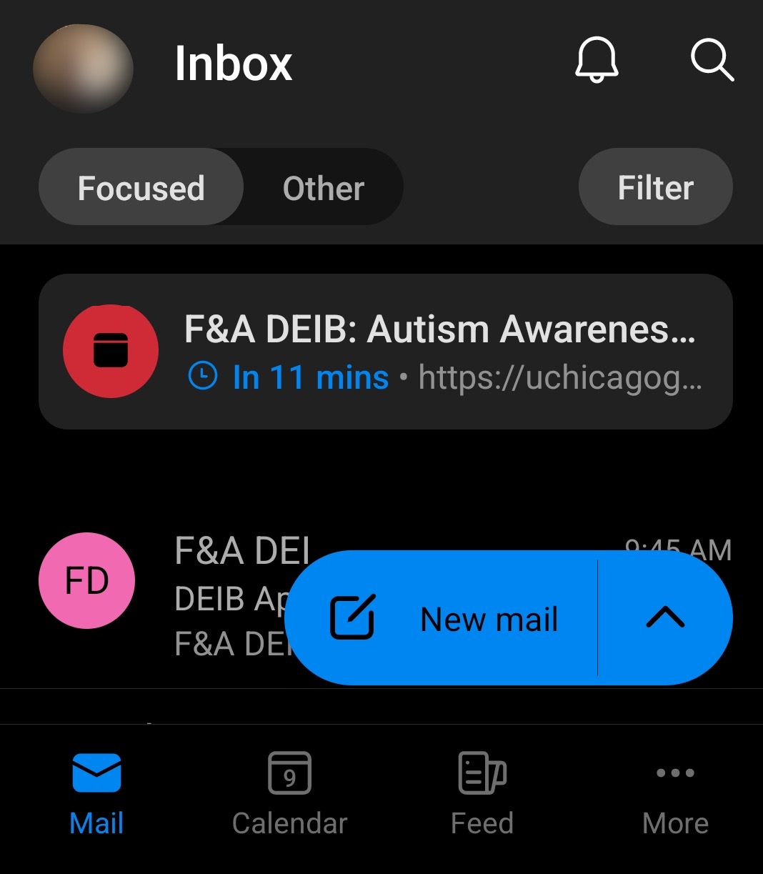 - Outlook redirects you to your Focused Inbox. You can see your Mail, Calendar, and other Applications by tapping on the icons located at the bottom of the screen.