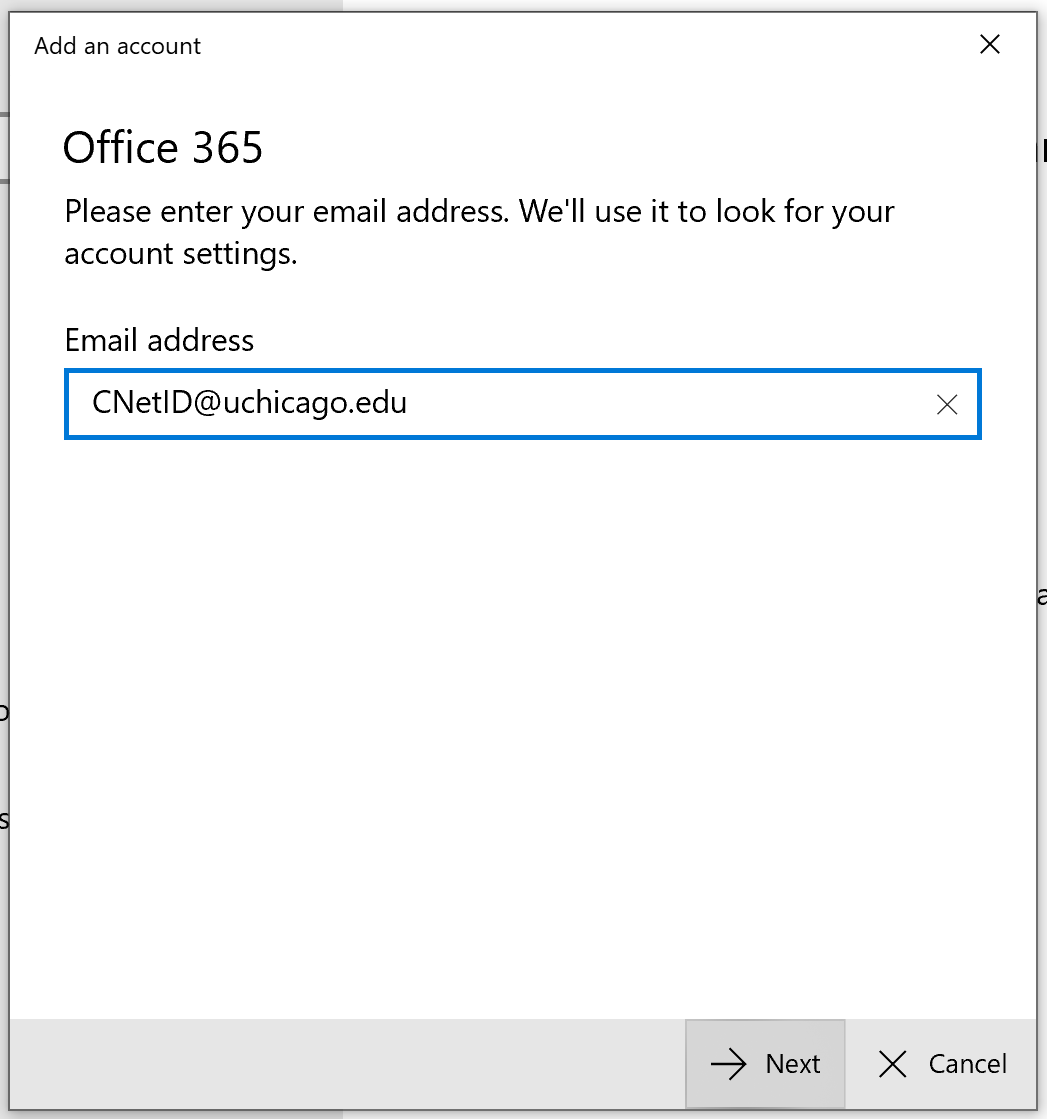 - Open Outlook. If it detects your account, you can select Add CNetID@uchicago.edu.