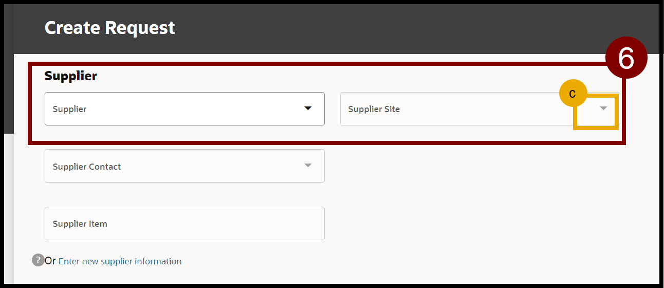 - If nothing populates in the Supplier Site box, select the dropdown to choose the appropriate site.