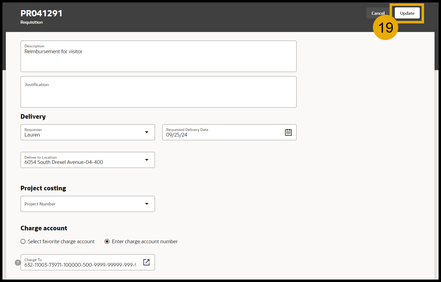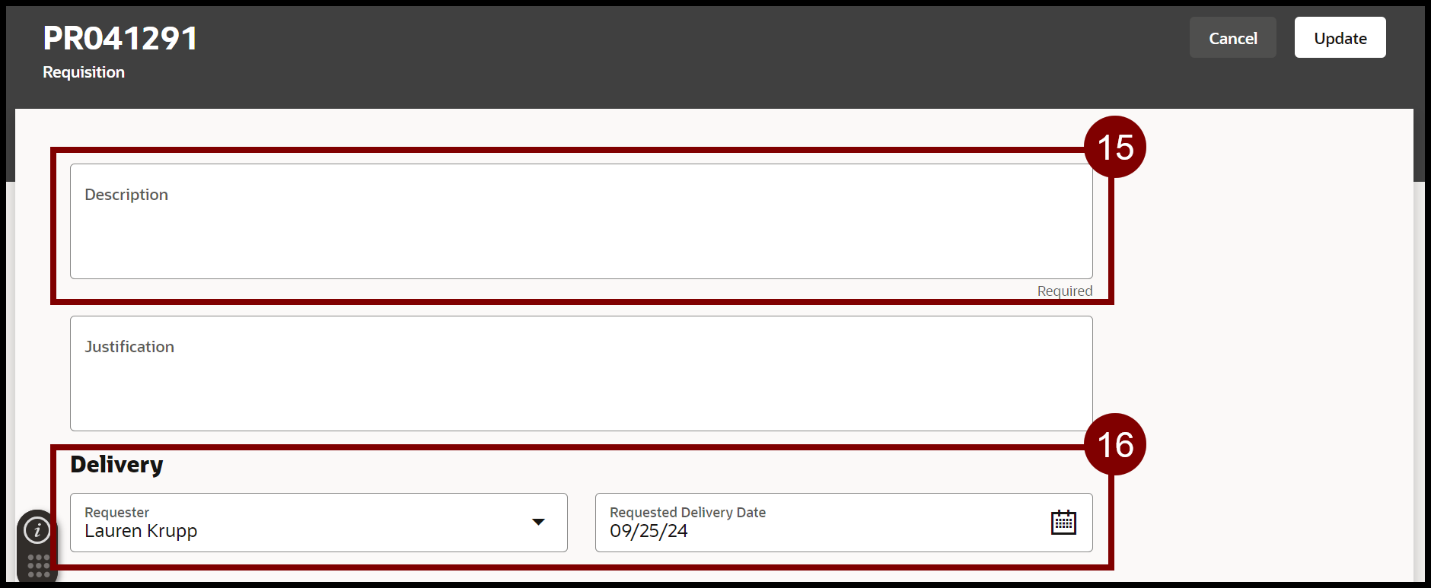 - Update the Requester and Requested Delivery Date if necessary.