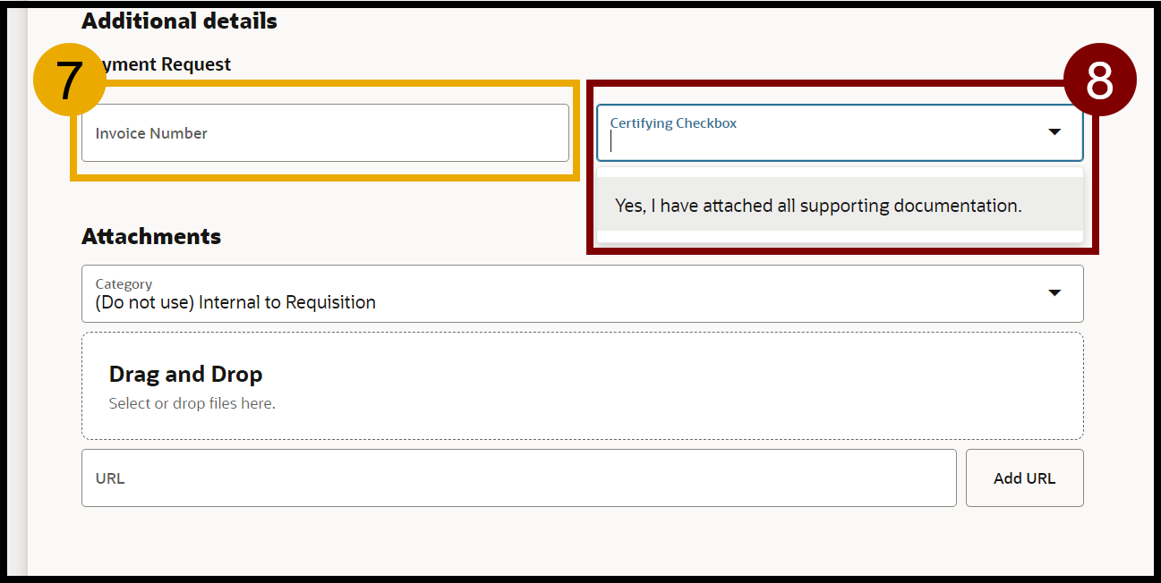 - If the supporting document has an invoice number, make sure to enter it in the Invoice Number field to prevent the invoice from being paid multiple times.