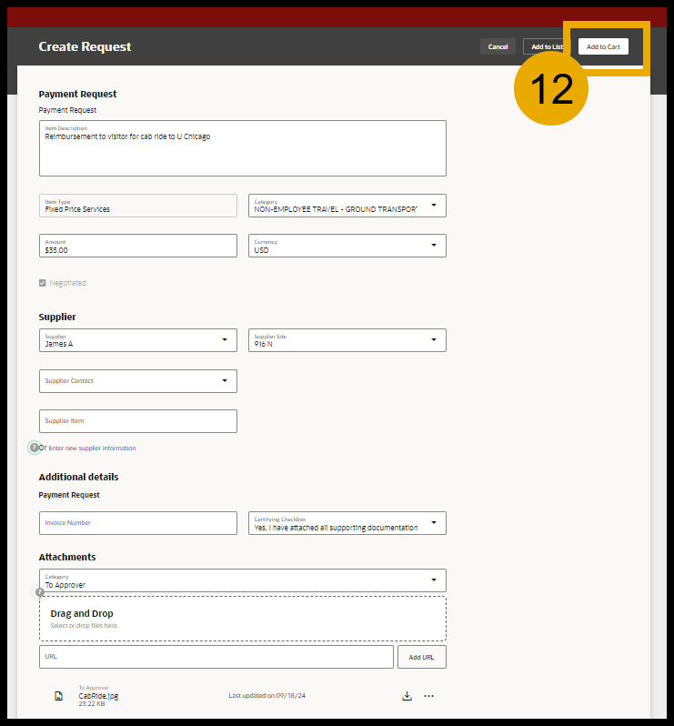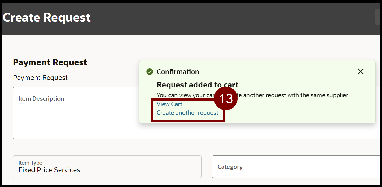 - If you need to create another Payment Request for the same supplier, select Create another request and follow steps 5-12. If you do not need to create another Payment request, select View Cart.