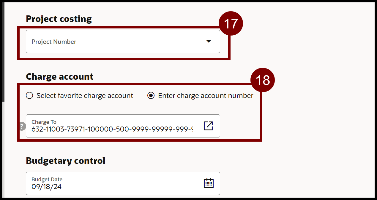 - For Chart of Accounts related purchases, verify the COA string in the Charge To box. If that is not the appropriate COA, either choose Select favorite charge account and pick one from the dropdown list or choose Enter charge account number and type in the appropriate COA string.