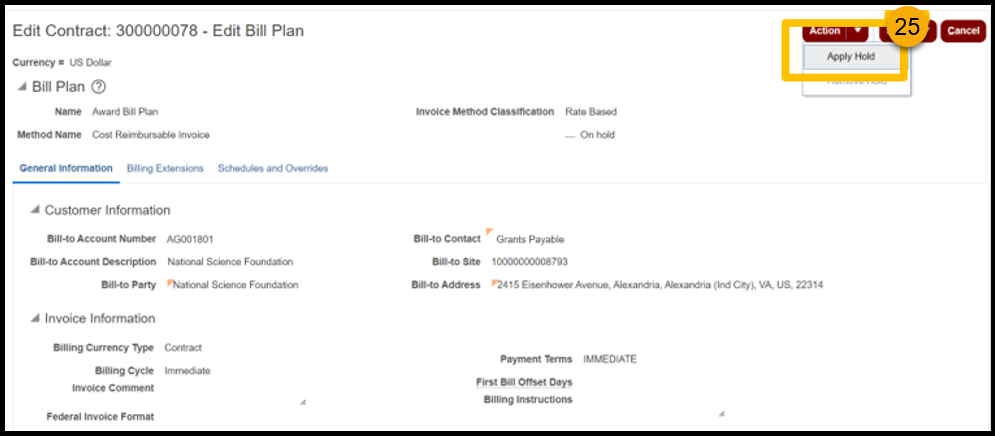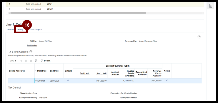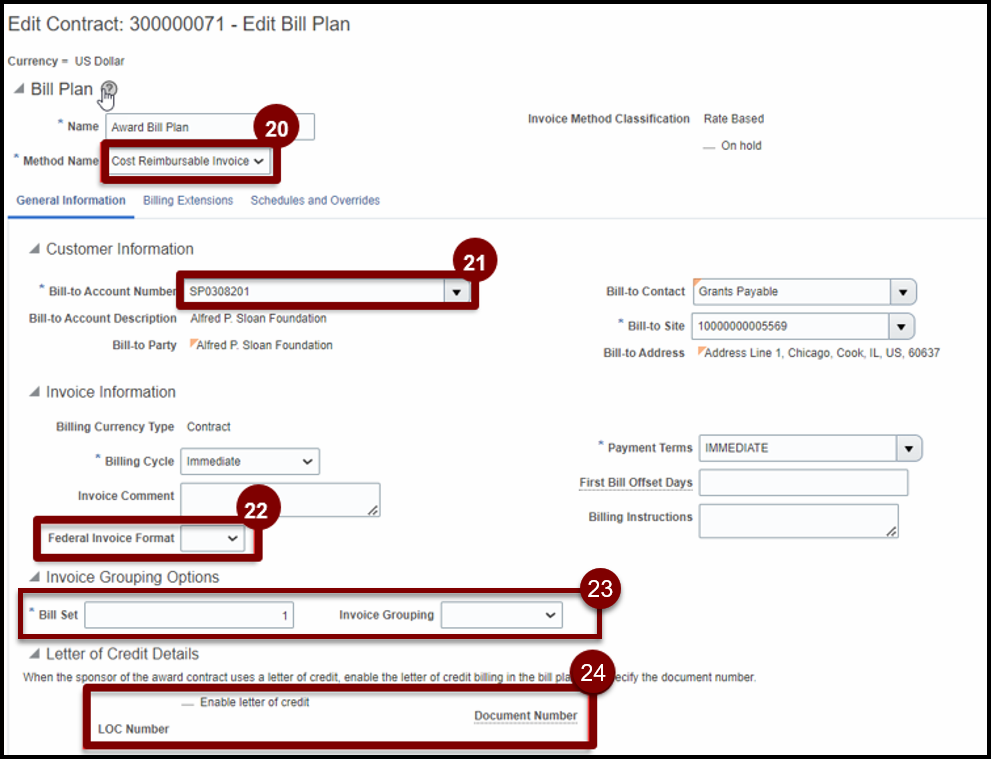 - Review the Agreement Type, Bill Type, and Sponsor PO Number information.