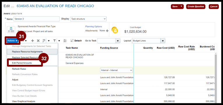 - To edit Period Amounts for added rows, highlight one of the new rows, then select Actions.
