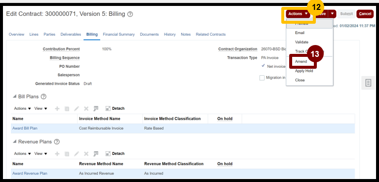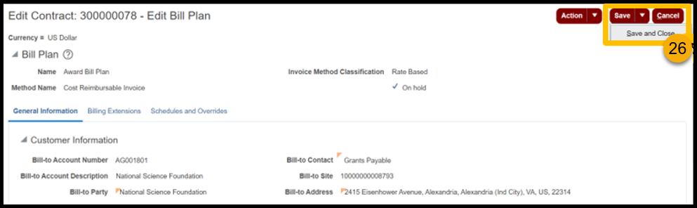 - Contract: A record incorporating the necessary billing attributes and revenue attributes for the generation of invoices and revenue recognition to occur for an award.