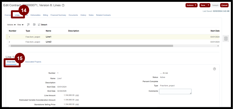 Contract Management -> Contracts -> Lines page, Associated Projects tab