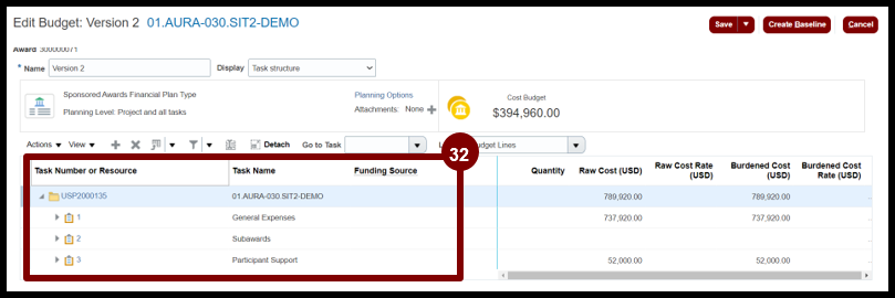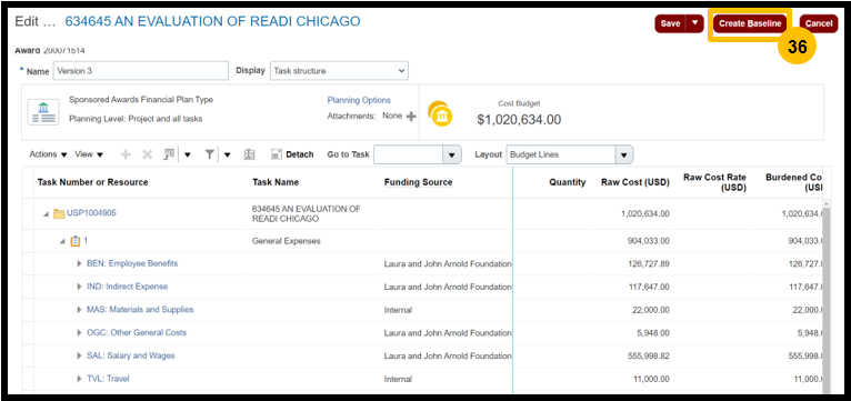 - Select Create Baseline after confirming the categories, funding source, and amounts are correct.