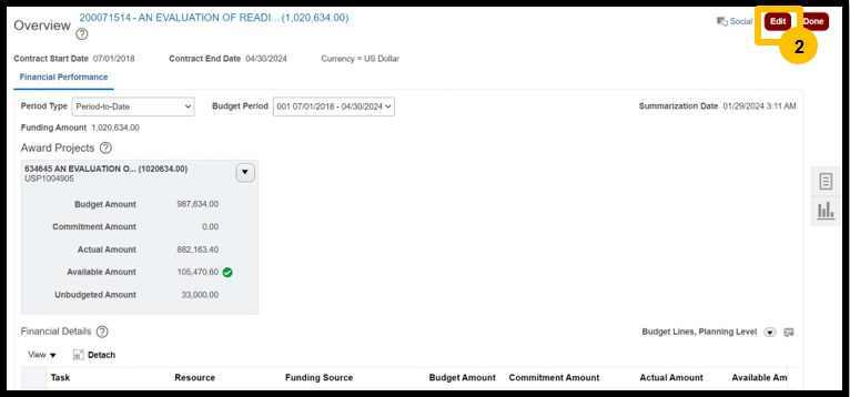 - Select the pencil icon below the Budget Period to edit the Budget Period.