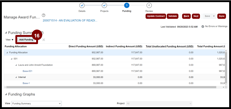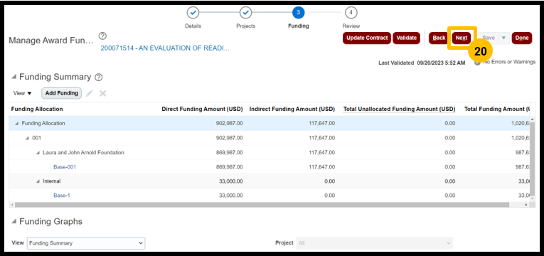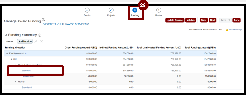 - Navigate to the Funding Whistlestop and review the Funding Summary. For awards with multiple projects, review the Project Allocations using the Base-001 hyperlink. For awards with Cost Share, there will also be a Internal Funding Allocation that should be reviewed.