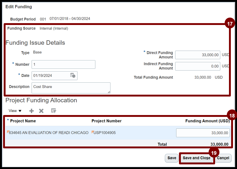 - Direct Funding Amount: variable. Enter the full cost share amount for the award.