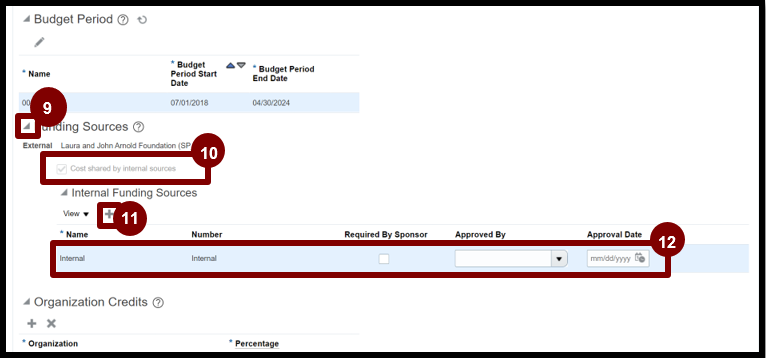 - Review the Funding Sources section. If the Award has Cost Share, then the Cost shared by internal sources checkbox should be checked.