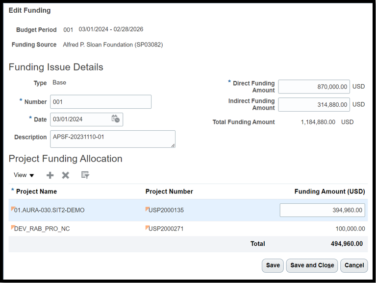 - Award Funding: The total anticipated funding, both direct and indirect, per Funding Source for an award.