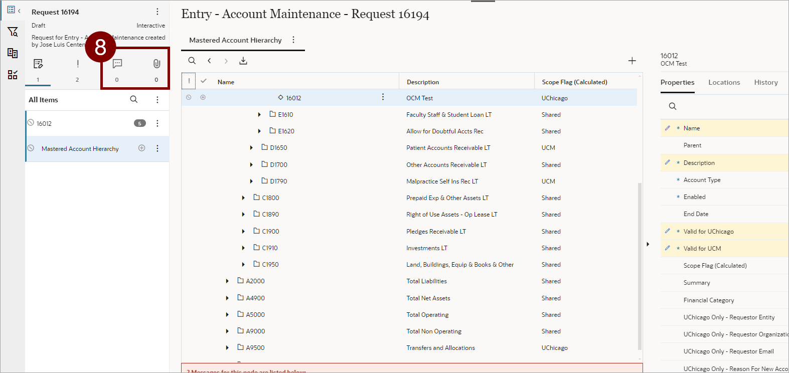 - After selecting one of the available options on the previous step, update the item’s properties by entering or updating all applicable fields in the Properties tab, located on the right-side of the screen. NOTE: All required fields, identified with an asterisk, must be filled out to proceed with the request. Other fields, while not marked as required, must also be updated to maintain data integrity. While some properties are common across all COA segments, others apply only to specific segments, causing the number of properties to vary by segment.