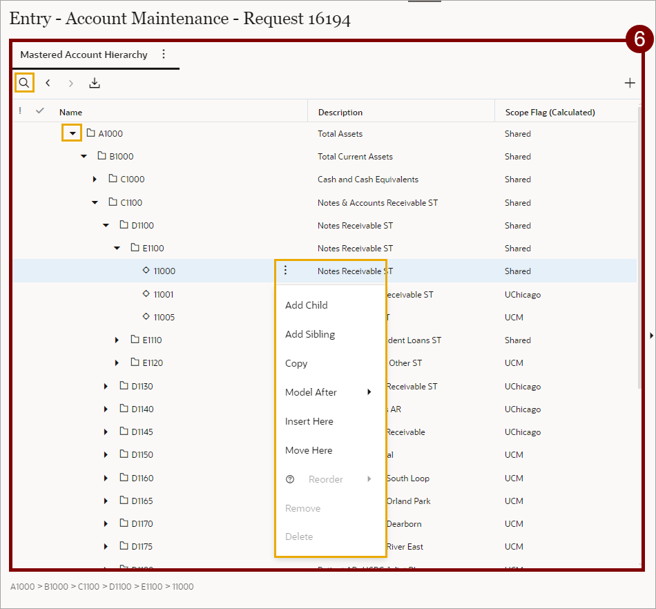 - For example, in the screenshot below, Account 11000 is selected in the hierarchy. If Add Sibling is chosen, the new value will be at the same level as 11000 (similar to 11001 and 11005).