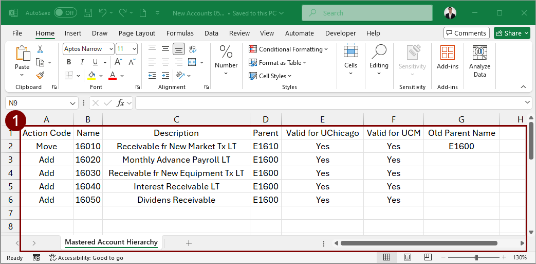 - The spreadsheet tab name must match the name of the Viewpoint (the tab at the top of the screen) where the file is being loaded. Typically, this will follow the format Mastered [COA segment] Hierarchy, such as Mastered Entity Hierarchy, Mastered Account Hierarchy or Mastered Fund Hierarchy.