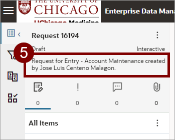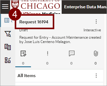 - On the left side of the screen, the Requests pane will appear. Change the title of the request by selecting the default name (which will read Request followed by a Number) and entering a new name. NOTE: Including the organization name in the request title (e.g., "Request for New Activity Segment – Booth Financial Administration") is recommended, as it allows for easier identification of department requests in EDM. The request title will also appear in the notification email sent to the approver.
