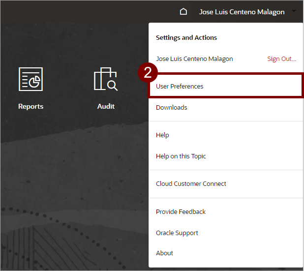 - On the top-right section of the Homepage, select the Username to access the Settings and Actions menu.