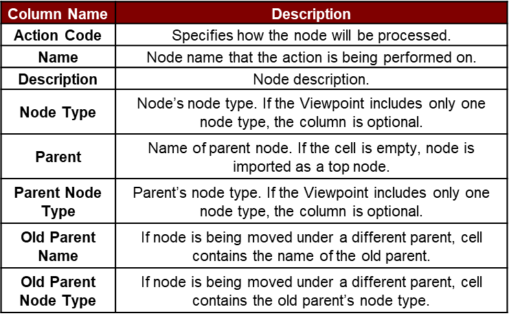 - The spreadsheet must include column headers that match the properties defined for the segment being updated. For example, if editing the Description and Parent properties, two separate columns must be added to the spreadsheet, each named after the corresponding property (Description and Parent). Columns can be placed in any order; however, it is recommended that the first column be Action Code (refer to the table below for a list of possible action codes), as it specifies the type of update being made. After adding the column headers, enter the corresponding values for the applicable changes under each column.