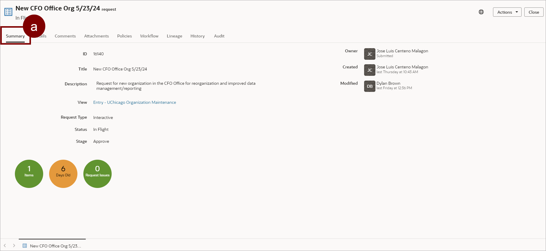 - Summary: Contains the ID, Description, View, Status, Request Type, and Stage of the request. It also shows the age of the request, the number of items, any issues, and who created, modified, and submitted the request.