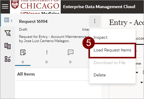- On the left side of the screen, the Requests pane will appear. Using the Vertical Ellipsis icon to the left of this pane, select Load Request Items.