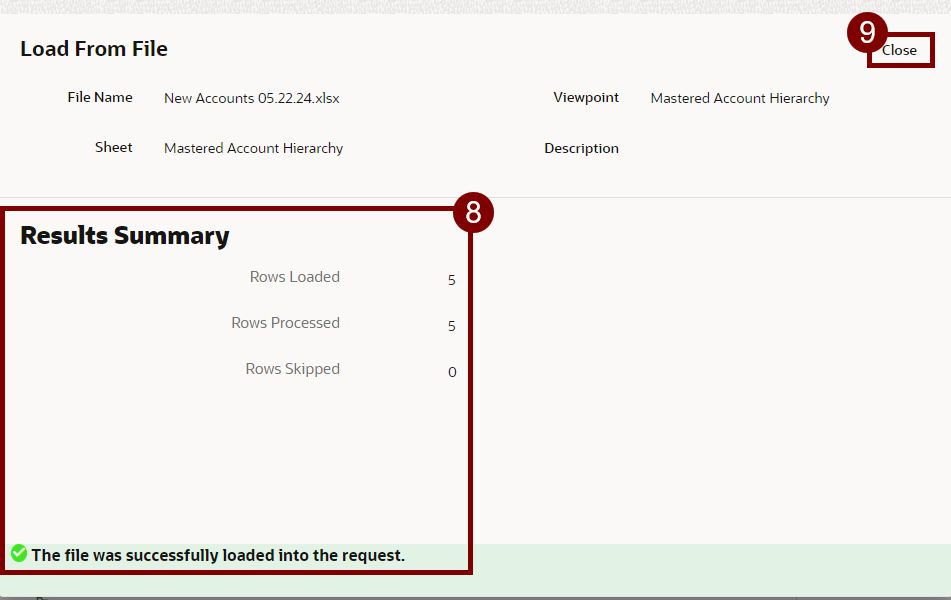 - If the file loads successfully, there will be a green message at the bottom and the results summary will show all rows loaded, processed, and skipped.
