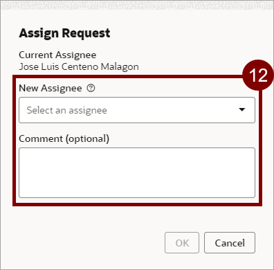 - In the Assign Request dialog box, use the dropdown under New Assignee to select the appropriate Entity Financial Manager, enter a Comment if necessary, and select OK.
