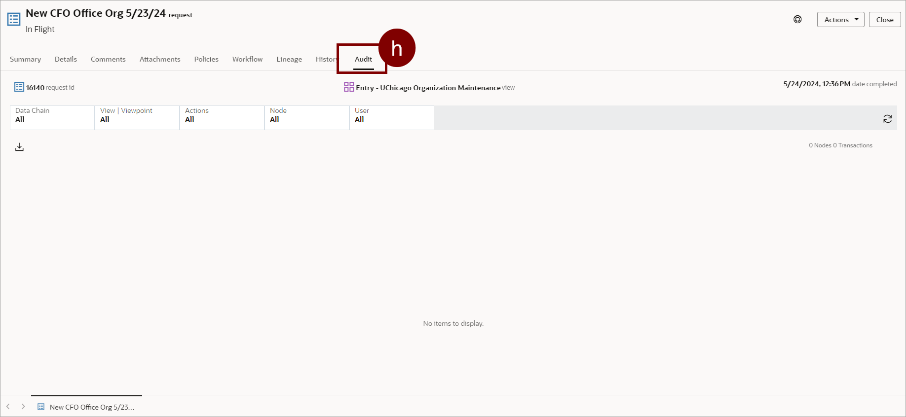 - Audit: Displays the transaction history associated with a request. This tab will only display information for Completed requests.