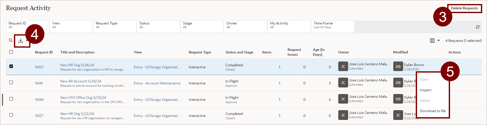 - To download the request summary or the details for selected requests in an Excel file, utilize the Download icon.