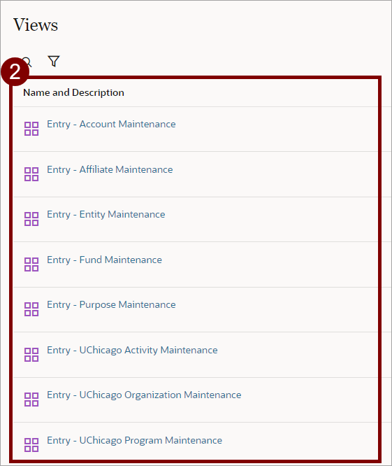 - From the list of Views, select the one representing the COA segment where the new request will be made. NOTE: Users will only see the Views for segments they are authorized to view or edit, depending on their role. The naming convention for these Views follows the format: Entry - [COA segment] Maintenance. For segments not shared between UCM and UChicago, the name will also indicate whether the segment is for UCM or UChicago. For example, to make changes to the Organization COA segment, select Entry – UChicago Organization Maintenance.