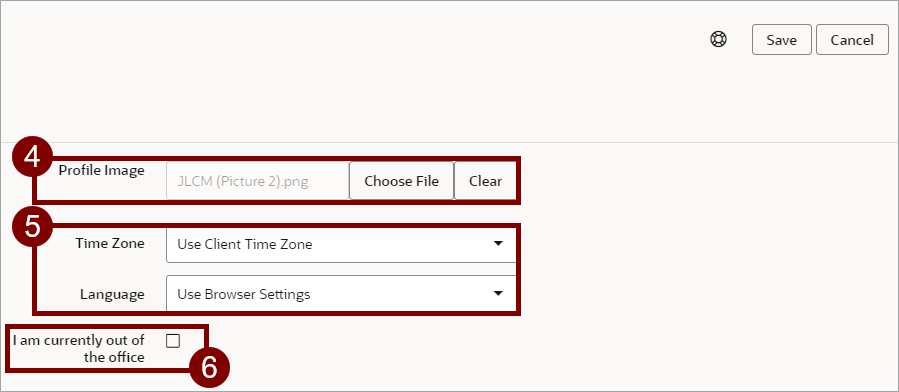 - Select Choose File to update a profile image and upload an appropriate file (.jpg, .png, or .gif). The file must be less than 2 MB. Use the Clear button to remove the profile image.