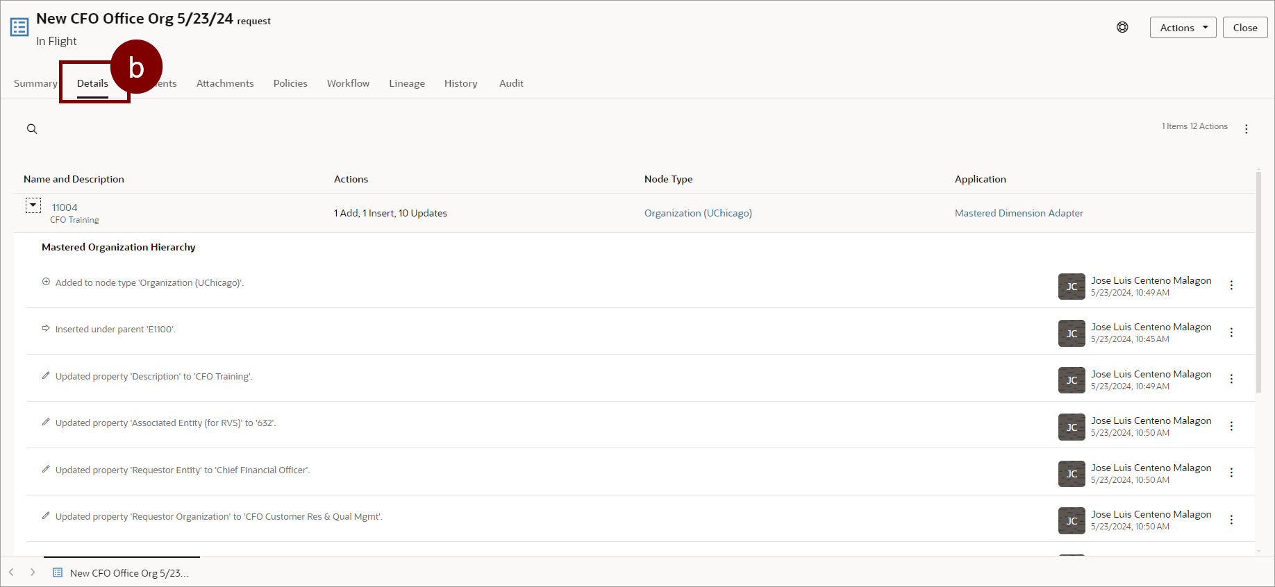 - Details: Displays a collapsed list of request items showing the affected node, the actions taken on the node, the person who performed the action, and the date and time each action was taken.