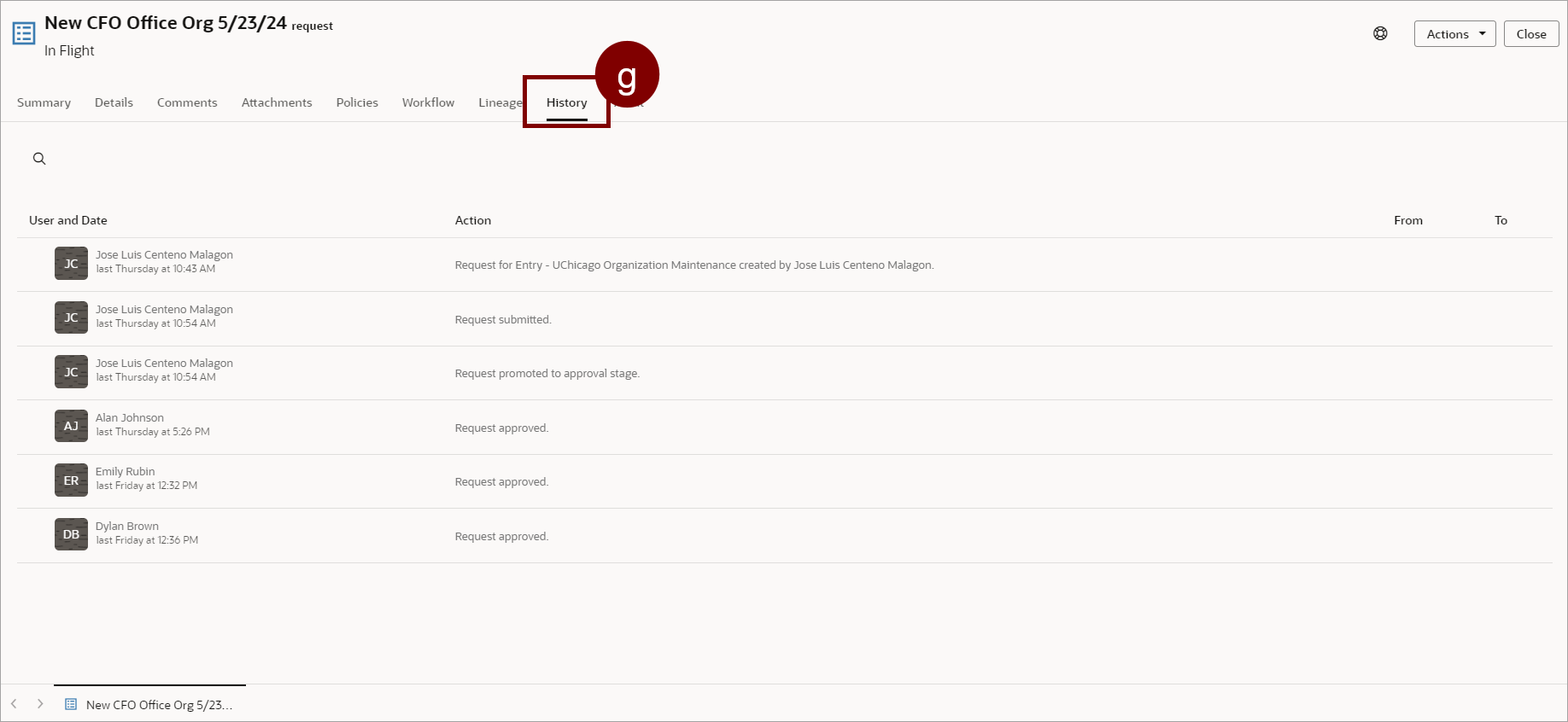 - History: Displays the history of a request, including who participated, what actions were taken, and when.